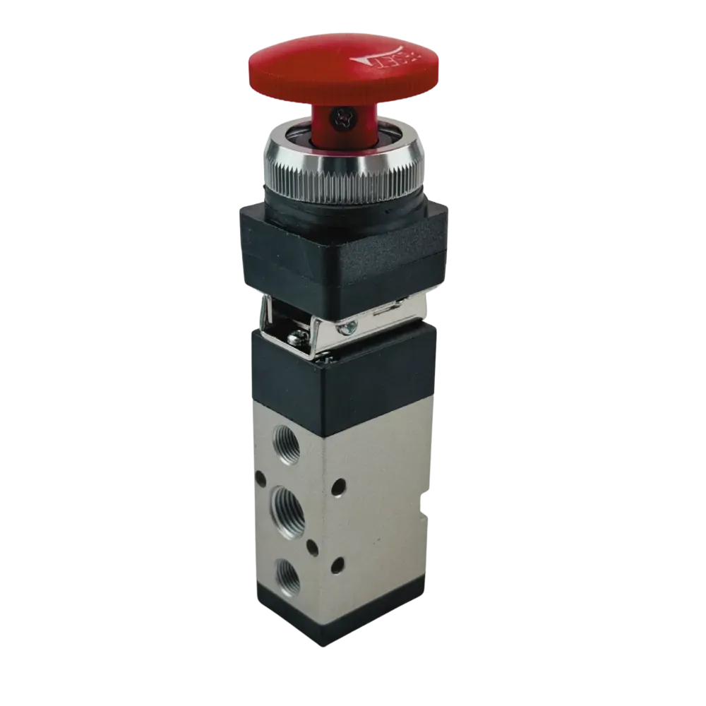 Inc GSTThis 5 way 2 position palm button latching valve is also commonly known as an emergency stop or e stop valve. This is because when it is pressed down it will remain there until it is twisted to be released. This is ideal for situations where you want the valve to stay in that position when pressed until the user resets it.