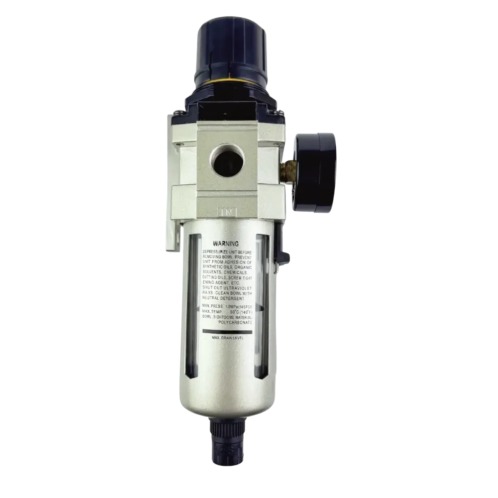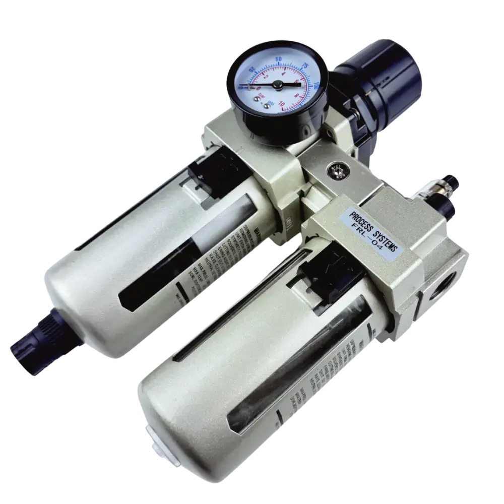 This combo unit combines a filter regulator and a lubricator into the one unit. The first part is the filter regulator where the air pressure is set and the air is cleaned. It then runs through the lubricator which will introduce lubrication into the line through the use of a venturi.