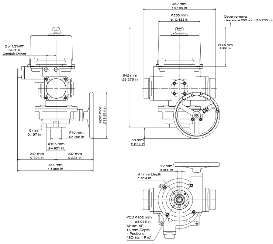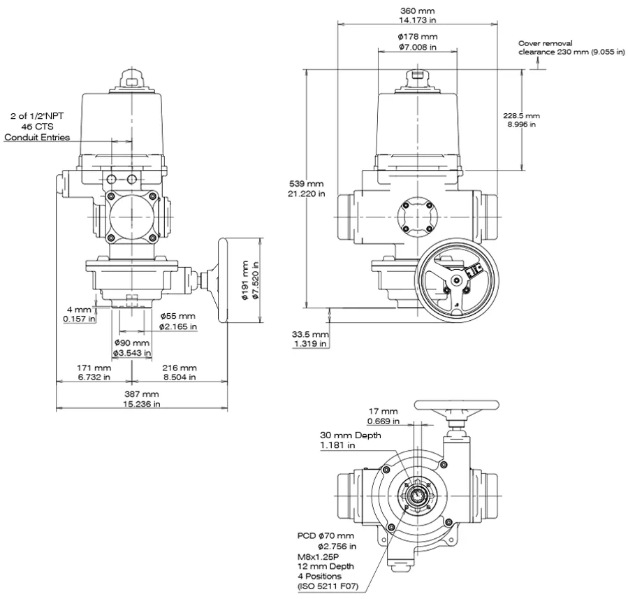 These 90 degree turn (1/4 turn) electric actuators have a spring return function. This allows them to be used in fail safe applications where the actuator must return to a predetermined position (open or closed) if power is lost. They come standard with a visual indicator and IP67 weather protection.