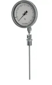 Inc GSTBadotherm bimetal Temperature gauge utilise an all 316 Stainless Steel construction. The bimetal temperature gauge is a coiled metallic strip made from two metals which have different temperature characteristics. As the temperature increases or decreases the bimetal coil rotates. The end of the coil connects to an axle which iis connected to a pointer. This give a simple, maintenance free operation fo the temperature gauge.